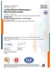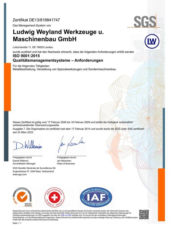Die Firma Ludwig Weyland Werkzeuge und Maschinenbau GmbH erfüllt das Qualitätmanagement nach den Normen der DIN EN ISO 9001:2015 und wurde vom TÜV Saarland zertifiziert.